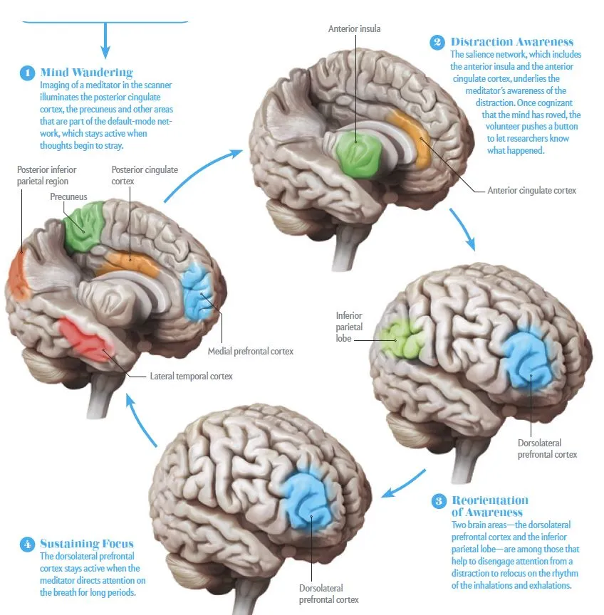 When left unattended the mind drifts from thought to thought and stimuli to stimuli. The circuit of the brain that operates in this unfocused mode is called the default mode network. According to research, activity of the default mode network is correlated with rumination, depression, and other less desirable states.