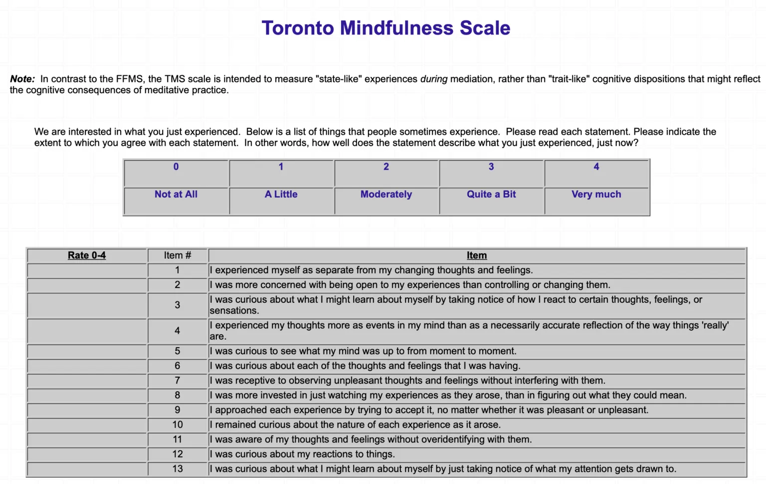 Developed in 2006, this mindfulness questionnaire was the first to measure state mindfulness – right after a meditation session it would ask you to rate your experience bringing insight into the meditative state. This scale measures two aspects of the meditative state: curiosity and decentering. To get the the items (3,5,6,10,12,13) and to get the decentering score add the items (1,2 ,4,7 ,8 ,9,11).
